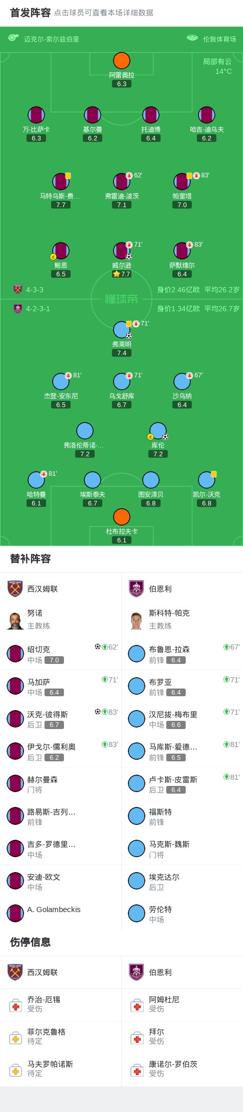 第44分钟,威尔逊门前头球得分,比分被扳平,西汉姆联1-1伯恩利