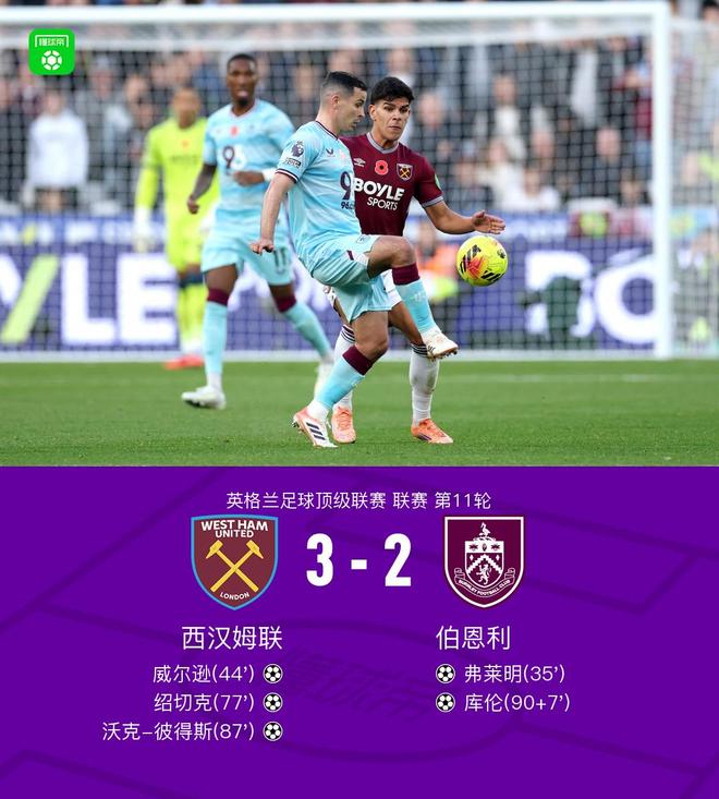 北京时间11月8日23:00,英格兰足球超级联赛第11轮,西汉姆联坐镇主场迎战伯恩利。比赛中,,弗莱明接应破门率先打破僵局,威尔逊抓住机会扳平比分;易边再战,西汉姆联持续施压,绍切克、沃克-彼得斯抓住对方门将失误,连下两城。临近结束,库伦在补时阶段攻入一球。最终全场战罢,西汉姆联以3-2战胜伯恩利。